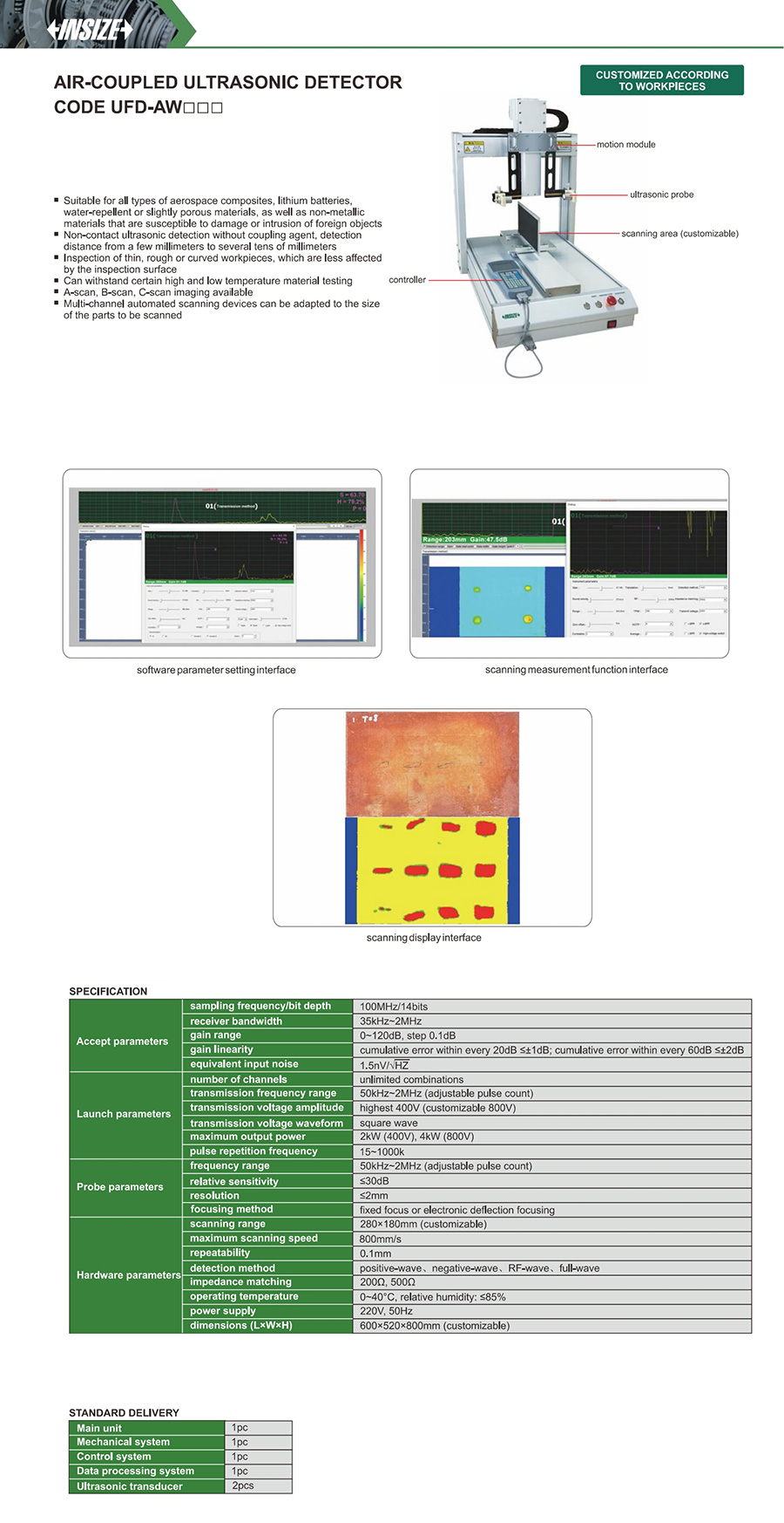 | UFD-AW□□□ | ≤2mm | 0.1mm | 800mm/s | 0~120dB, step 0.1dB | 35kHz~2MHz | 50kHz~2MHz | ≤30dB |