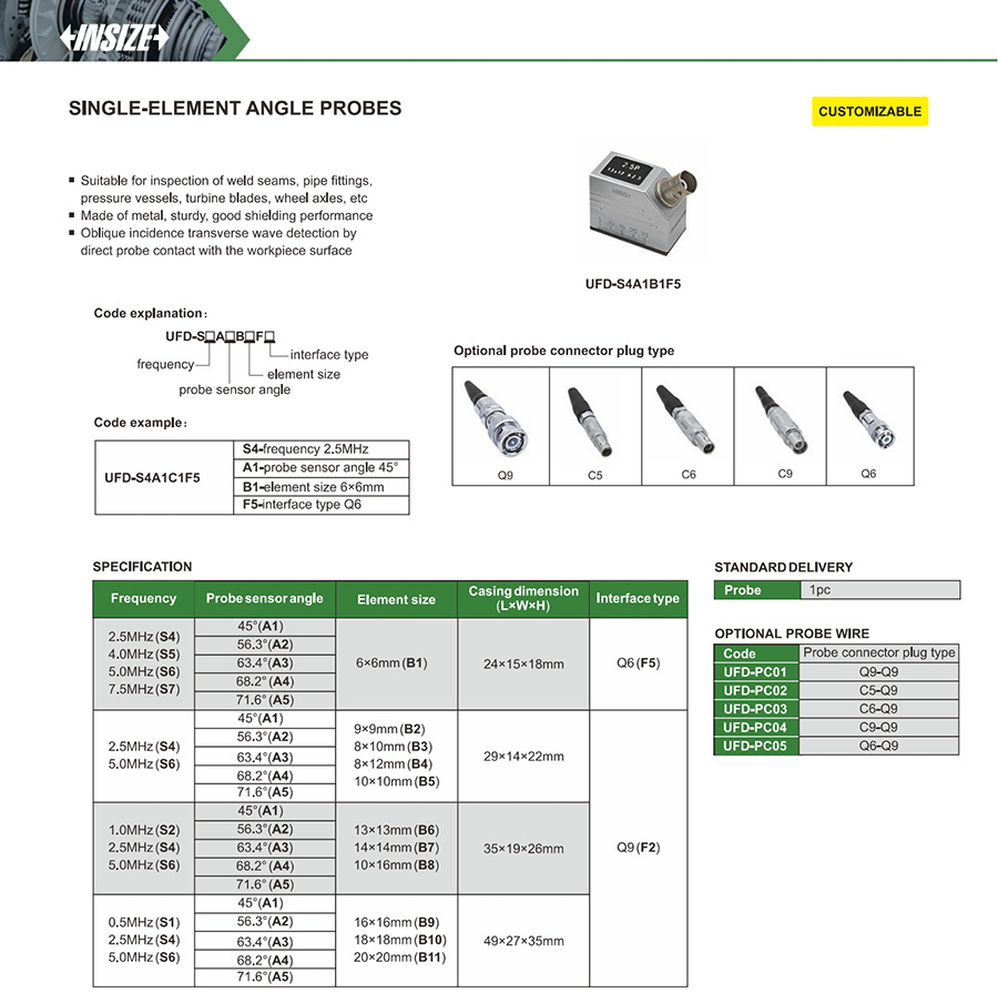 | UFD-S□A□B□F□ | 0.5MHz (S1), 2.5MHz (S4), 5.0MHz (S6) | 45°(A1), 56.3°(A2), 63.4°(A3), 68.2° (A4), 71.6° (A5) | 16×16mm (B9), 18×18mm (B10), 20×20mm (B11) | Q9 (F2) |