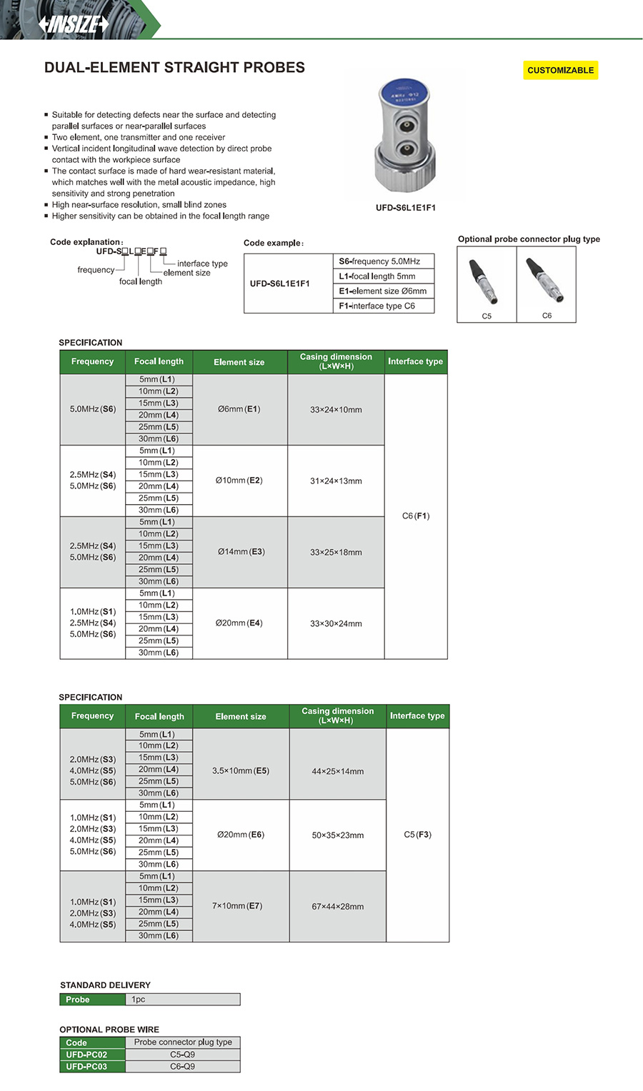 | UFD-S□L□E□F□ | 1.0MHz (S1), 2.0MHz (S3), 4.0MHz (S5) | 5mm (L1), 10mm (L2), 15mm (L3), 20mm (L4), 25mm (L5), 30mm (L6) | 7×10mm (E7) | C5 (F3) |