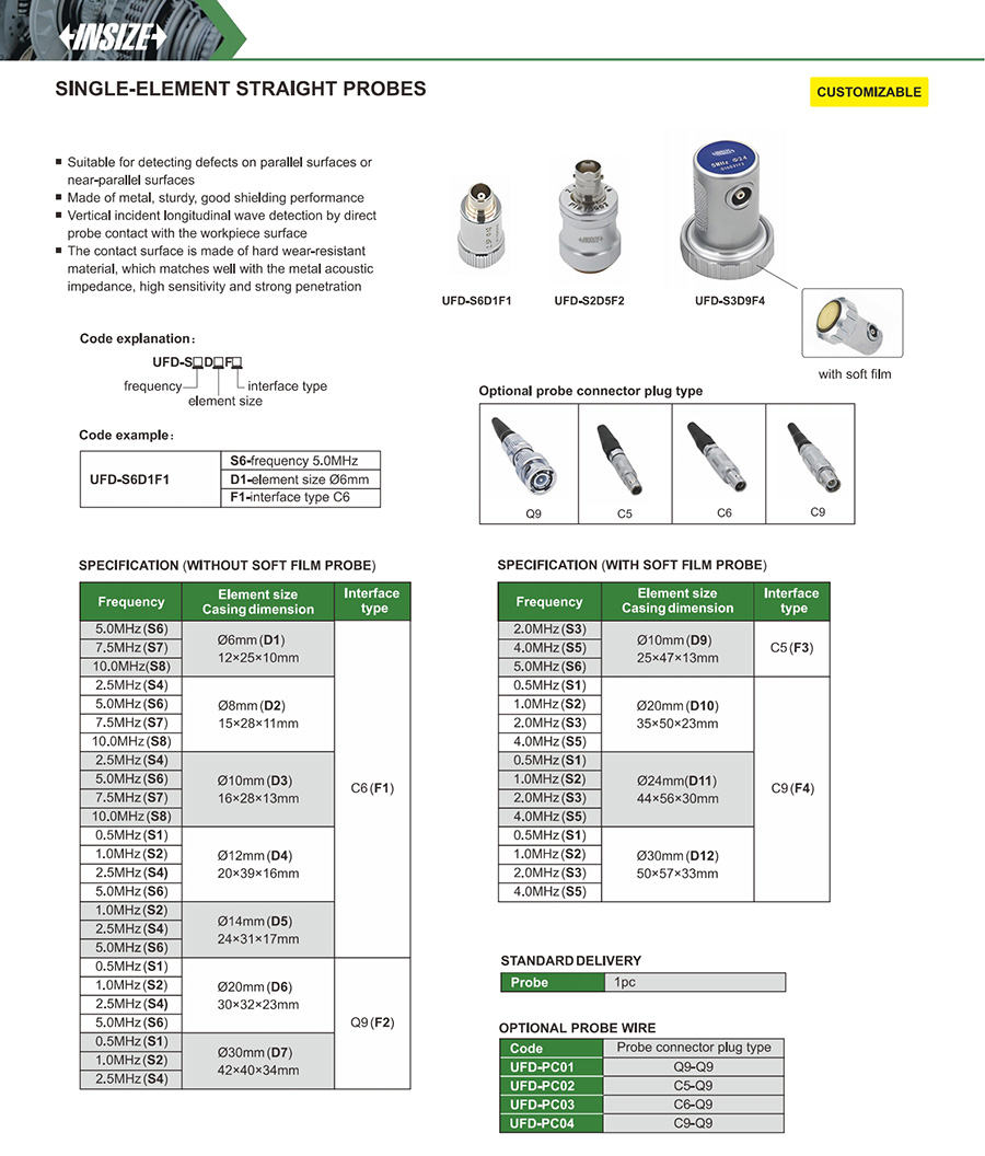 | UFD-S□D□F□ | 0.5MHz (S1), 1.0MHz (S2), 2.0MHz (S3), 4.0MHz (S5) | C9 (F4) | Ø30mm (D12), 50x57x33mm |
