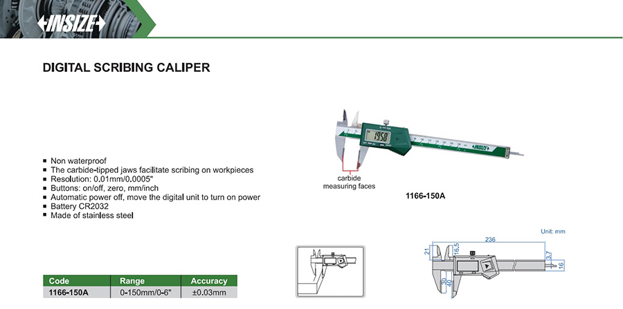 | 1166-150A | 0-150mm/0-6" | ±0.03mm | 0.01mm/0.0005" | with data interface |