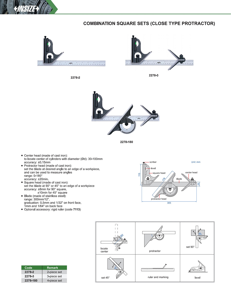 Protractor head (made of cast iron): set the blade at the desired angle to an edge of a workpiece, and can be used to measure angles range: 0-180°, accuracy: ±20min