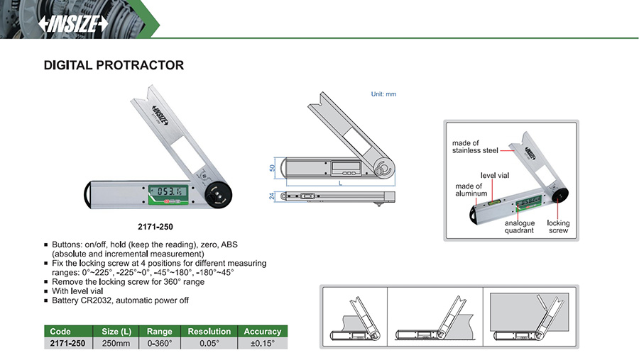 Home / Dimenzijska kontrola / Merilna orodja / Orodja za merjenje kotov, ravnosti in premosti / Protractors
