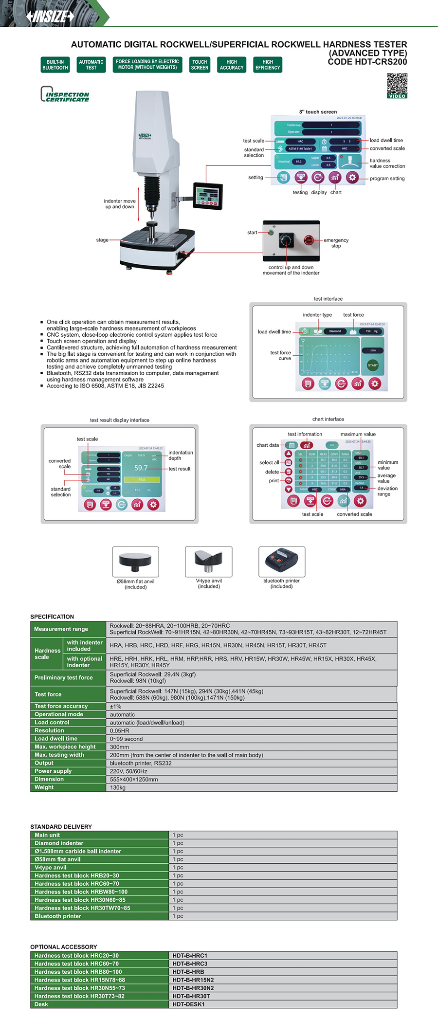 | HDT-CRS200 | 0.05HR | automatic (load/dwell/unload) | 300mm | 200mm | HRA, HRB, HRC, HRD, HRF, HRG, HR15N, HR30N, HR45N, HR15T, HR30T, HR45T |