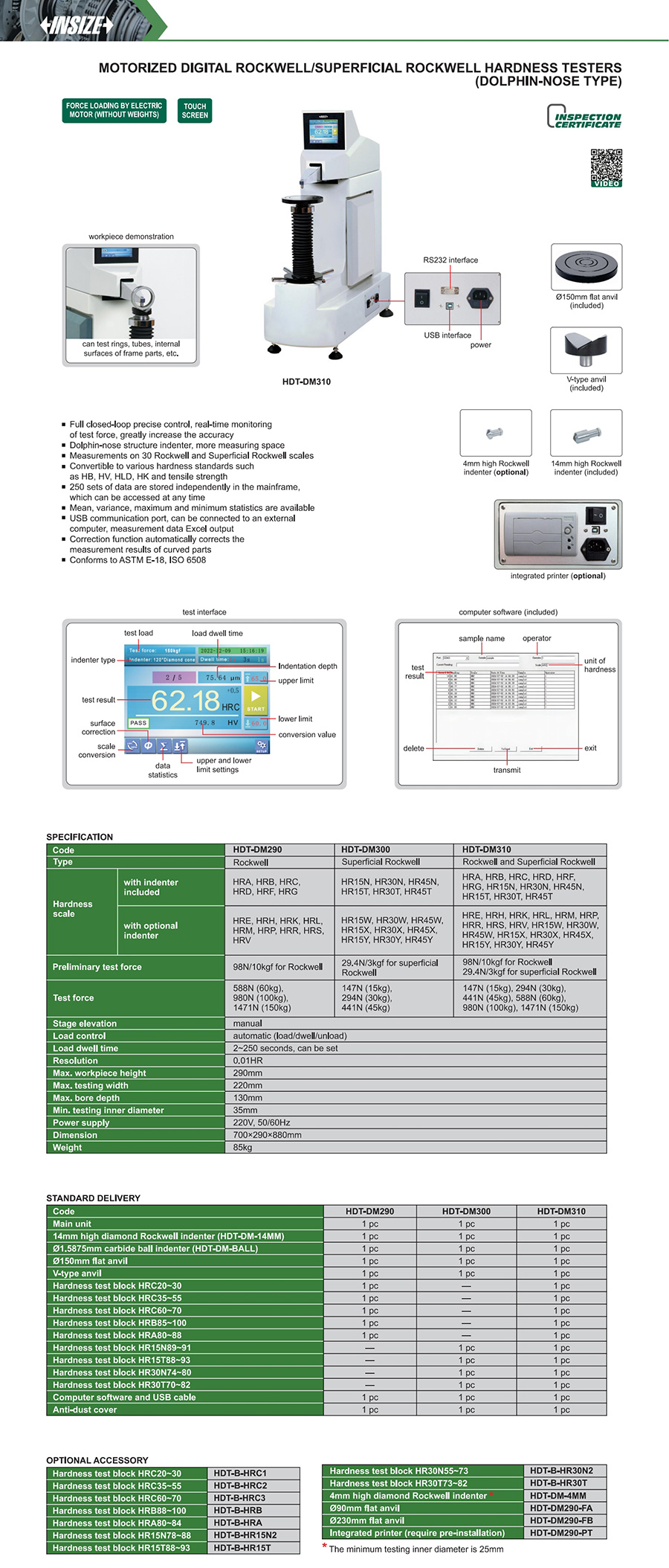| HDT-DM310 | 0.01HR | automatic (load/dwell/unload) | 290mm | 220mm | HRA, HRB, HRC, HRD, HRF, HRG, HR15N, HR30N, HR45N, HR15T, HR30T, HR45T |