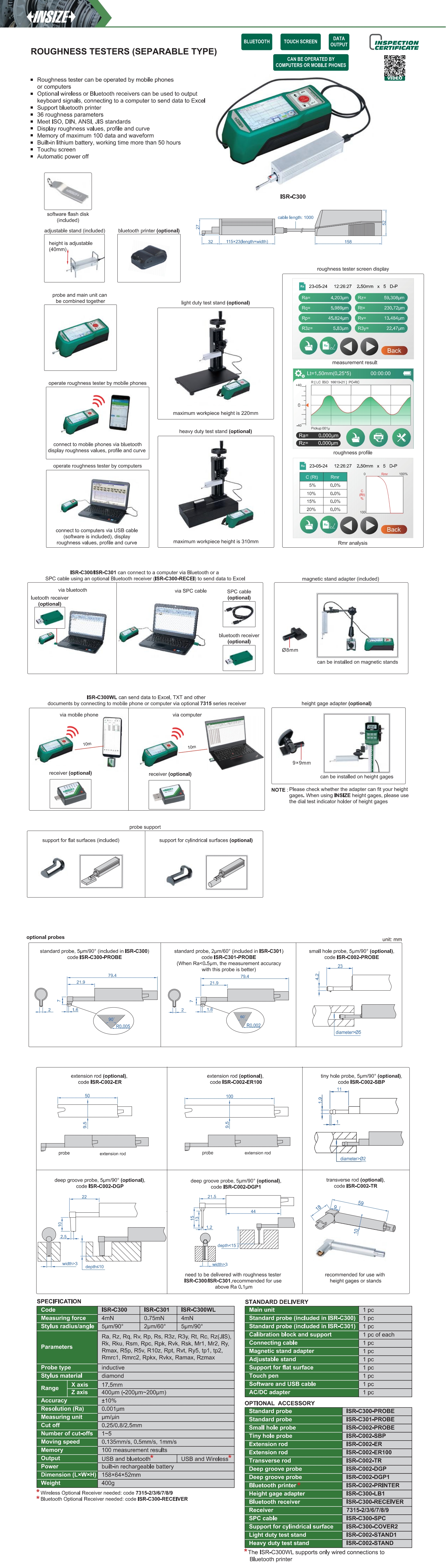 | ISR-C300 | X axis 17.5mm/Z axis 400µm (-200µm~200µm) | 4mN | 5µm/90° | USB and bluetooth |