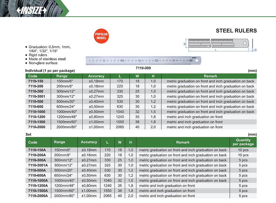 7110-300 300mm/12" ±0.27mm 0.5mm, 1mm, 1/64", 1/32", 1/16"