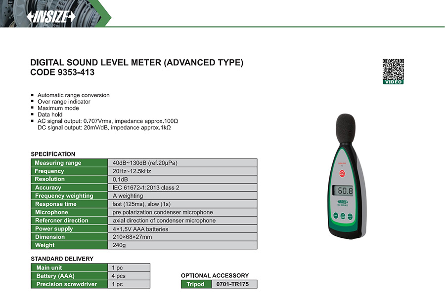 | 9353-413 | IEC 61672-1:2013 class 2 | 20Hz~12.5kHz | A weighting | no |
