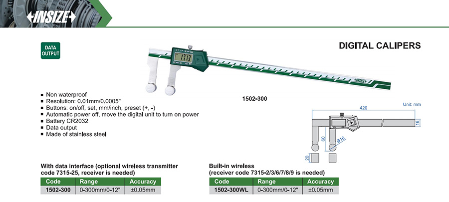 | 1502-300WL | 0-300mm/0-12" | ±0.05mm | 0.01mm/0.0005" | built-in wireless |