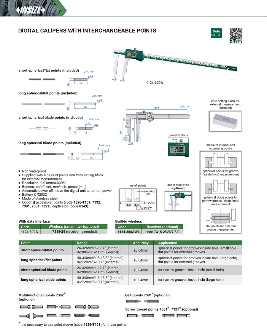 | 1124-300A | 40-340mm (internal), 0-272mm (external) | ±0.04mm | 0.01mm/0.0005" | with data interface | long spherical blade points |