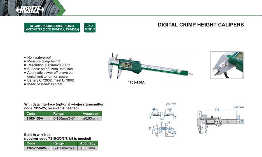 | 1165-150A | 0-150mm/0-6" | ±0.03mm | 0.01mm/0.0005" | with data interface |