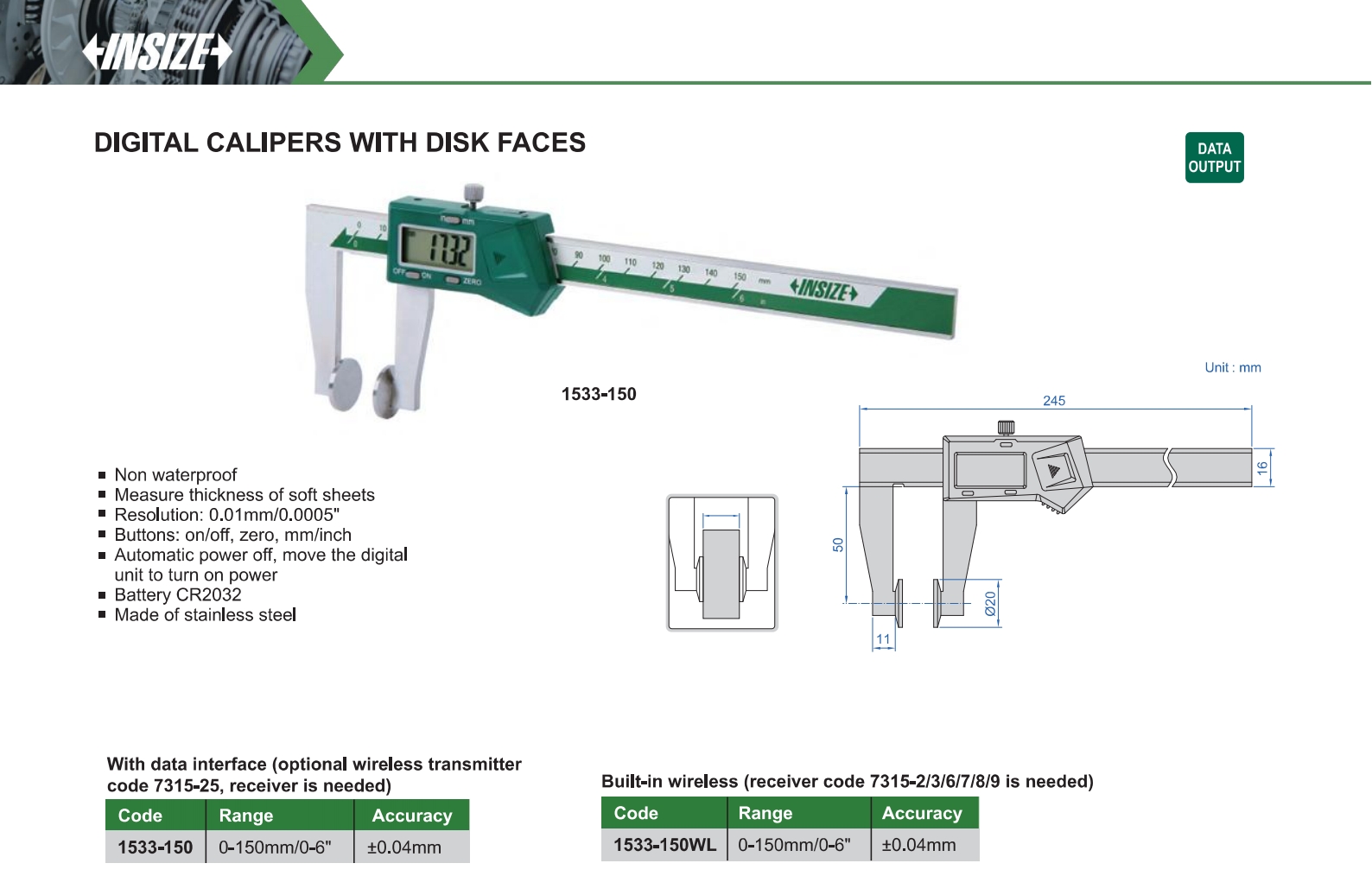 | 1533-150WL | 0-150mm/0-6" | ±0.04mm | 0.01mm/0.0005" | built-in wireless |