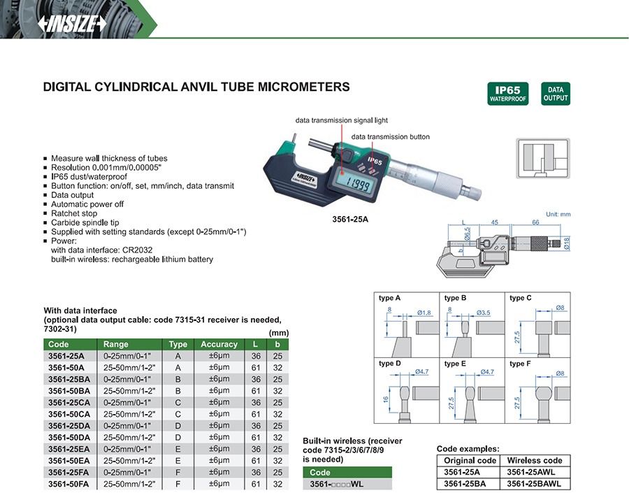 | 3561-25AWL | A | 0-25mm/0-1" | ±6μm | 0.001mm/0.00005" | built-in wireless |