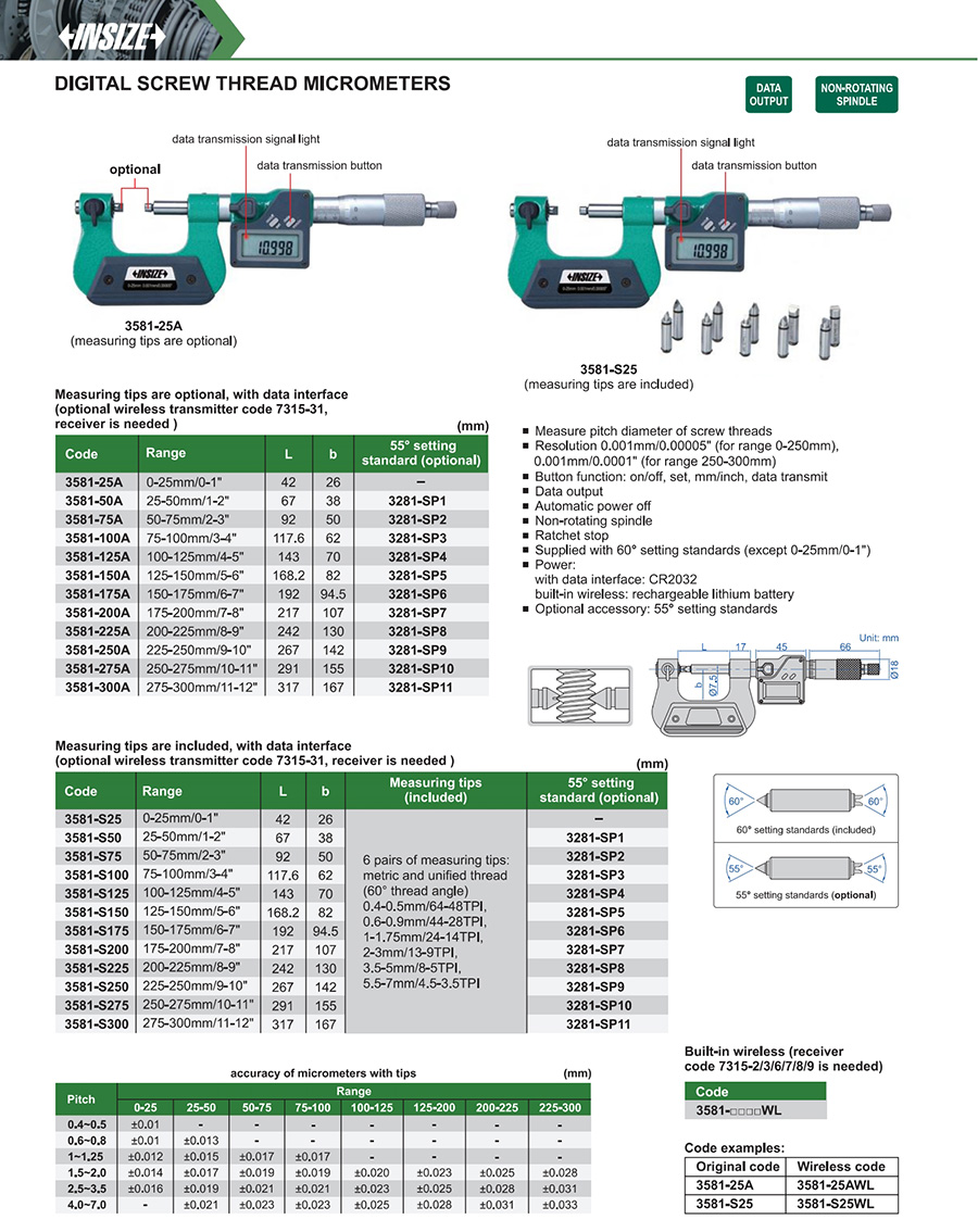 3581-75AWL 50-75mm/2-3" 0.001mm/0.00005" built-in wireless measuring tips are optional