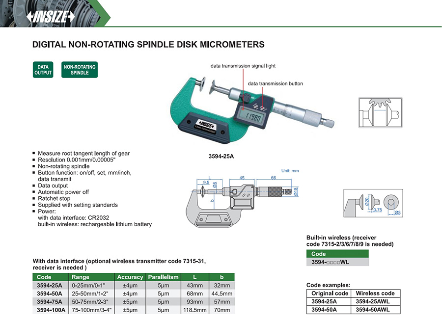 | 3594-25AWL | 0-25mm/0-1" | ±4μm | 0.001mm/0.00005" | built-in wireless |