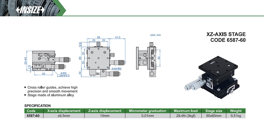 | Code | X-axis displacement | Z-axis displacement | Micrometer graduation | Stage size |