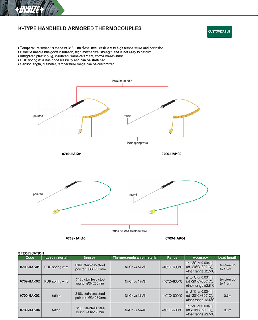0709-HAK01 K 316l stainless steel pointed, ø3×250mm -40°C~600°C ±1.1°C or .004∙|t| lead: tension up to 1.2m lead: PUP spring wire