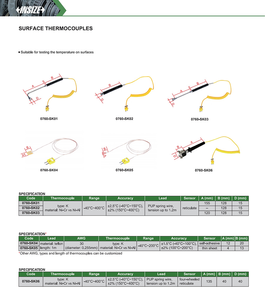 0760-SK02 K thermocouple -40°C~400°C ±2.5°C (-40°C~150°C), ±2% (150°C~400°C) lead: tension up to 1.2m lead: PUP spring wire B: 128mm, D: 15mm