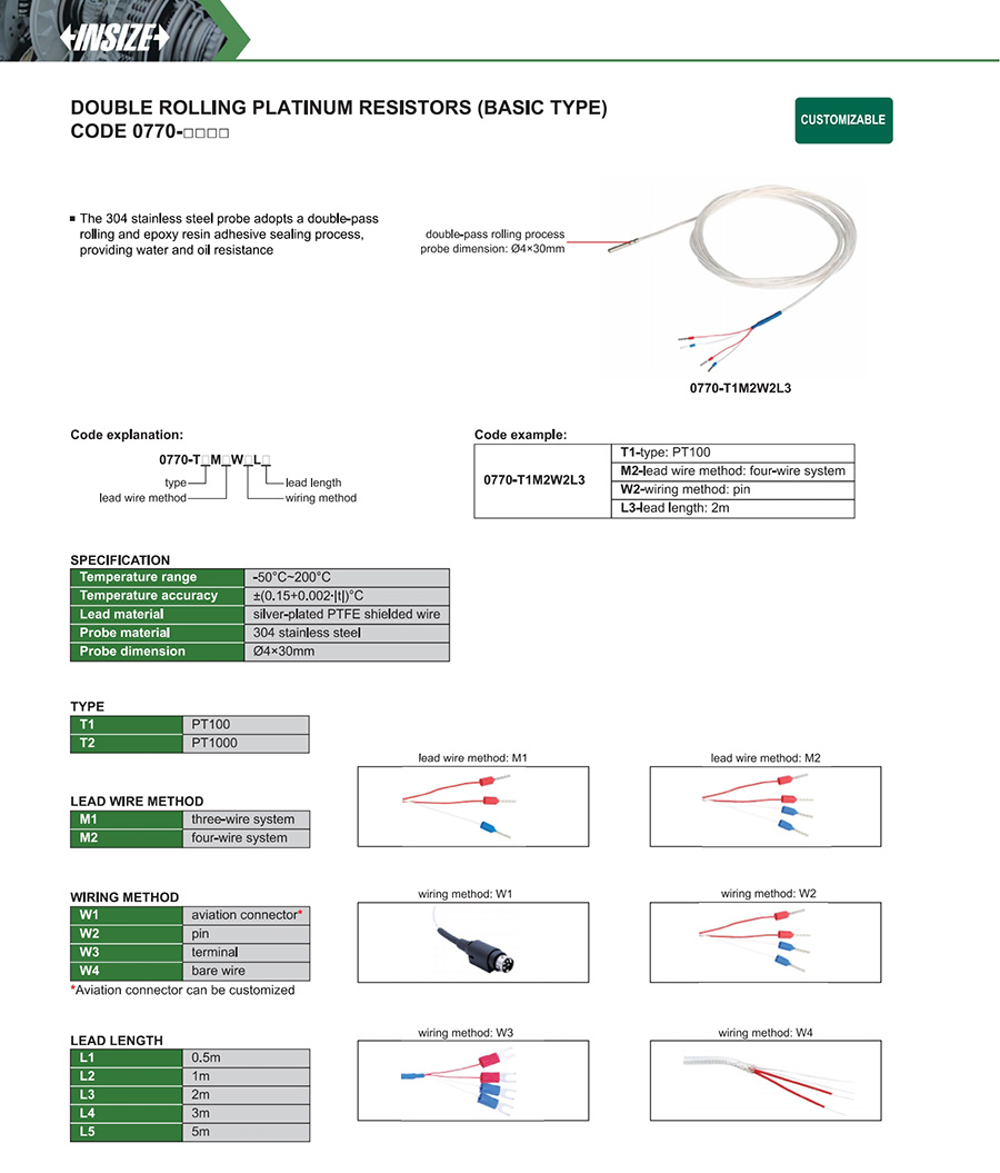 | 0770-□□ | PT100, PT1000 | platinum resistor | -50°C~200°C | ±(0.15+0.002∙|t|)°C |
