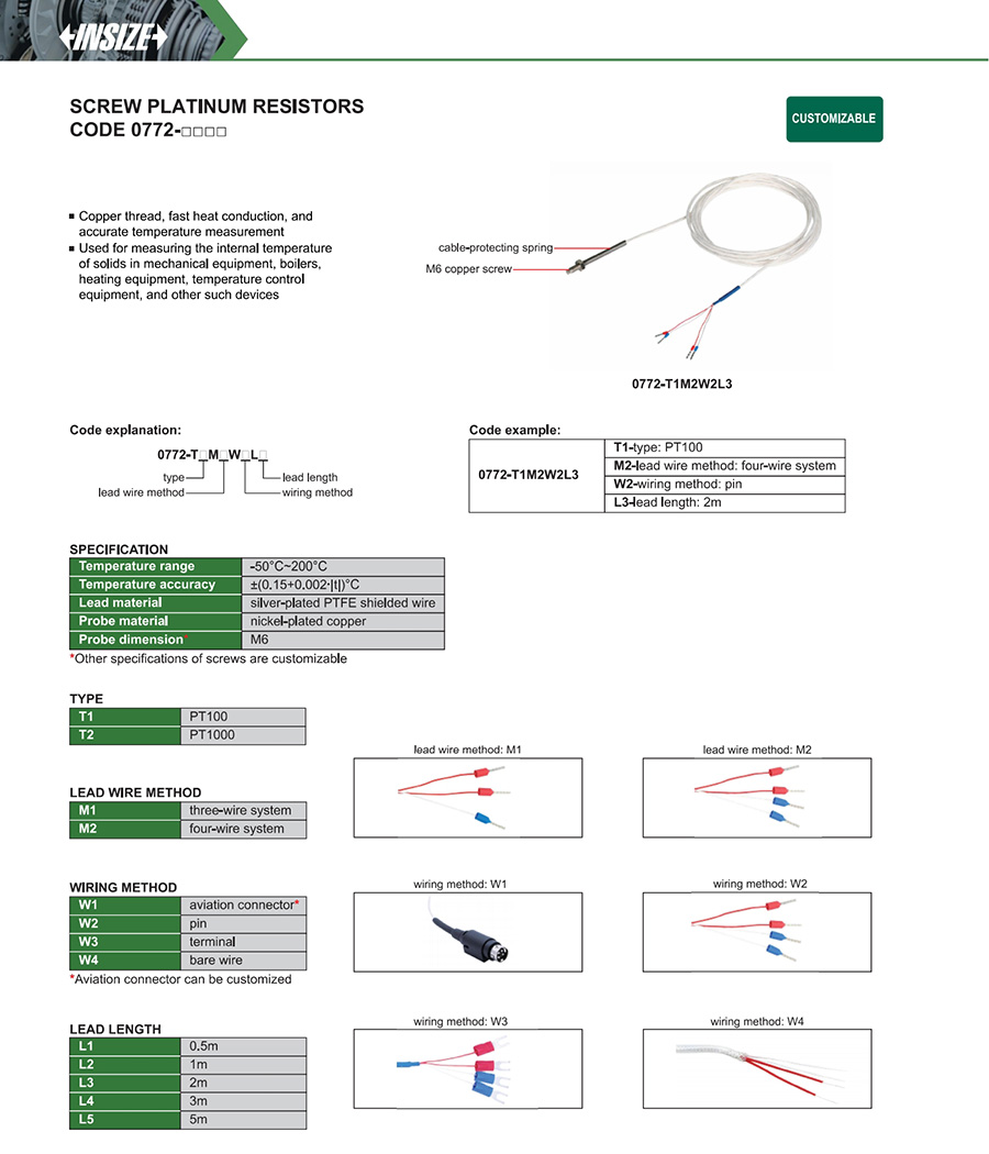 | 0772-□□ | PT100, PT1000 | platinum resistor | -50°C~200°C | ±(0.15+0.002∙|t|)°C |