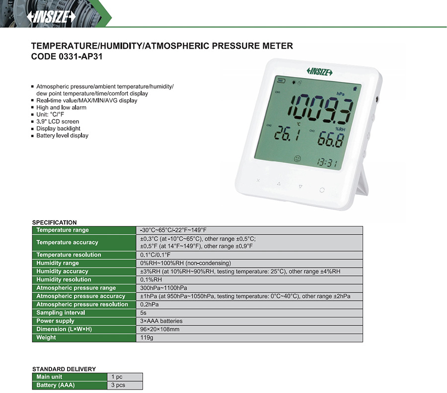 0331-AP31 digital internal ±0.3°C(at -10°C~65°C), other range ±0.5°C; ±0.5°F(at 14°F~149°F), other range ±0.9°F 0%RH~100%RH (non-condensing) ±3%RH (at 10%RH~90%RH, testing temperature: 25°C), other range ±4%RH yes -30°C~65°C/-22°F~149°F
