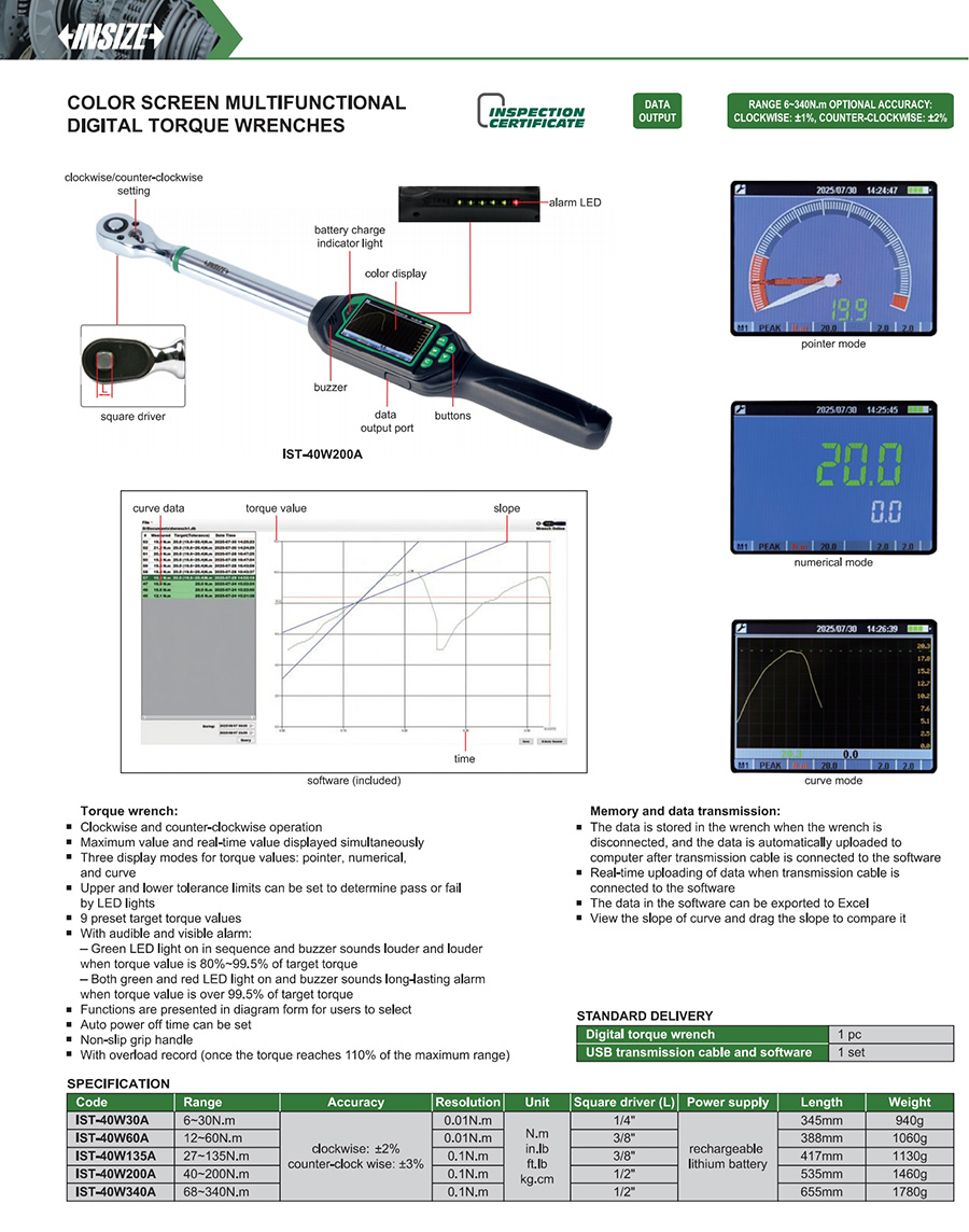 IST-40W340A digital 68~340N.m wired software transmission color screen and curve fixed ratchet head