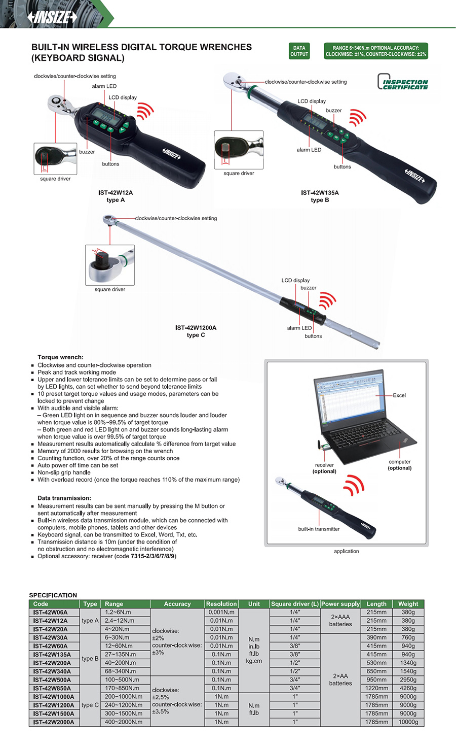 IST-42W2000A digital 400~2000N.m wireless transmission (keyboard signal) digital display fixed ratchet head