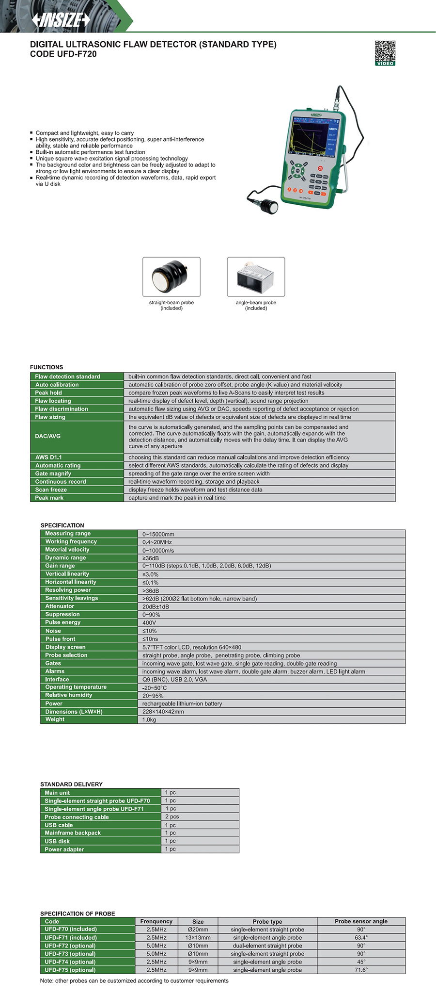 UFD-F720 0~15000mm 0.4~20MHz ≤3.0% ≤0.1% ≥36dB >36dB >62dB (200Ø2 flat bottom hole, narrow band)