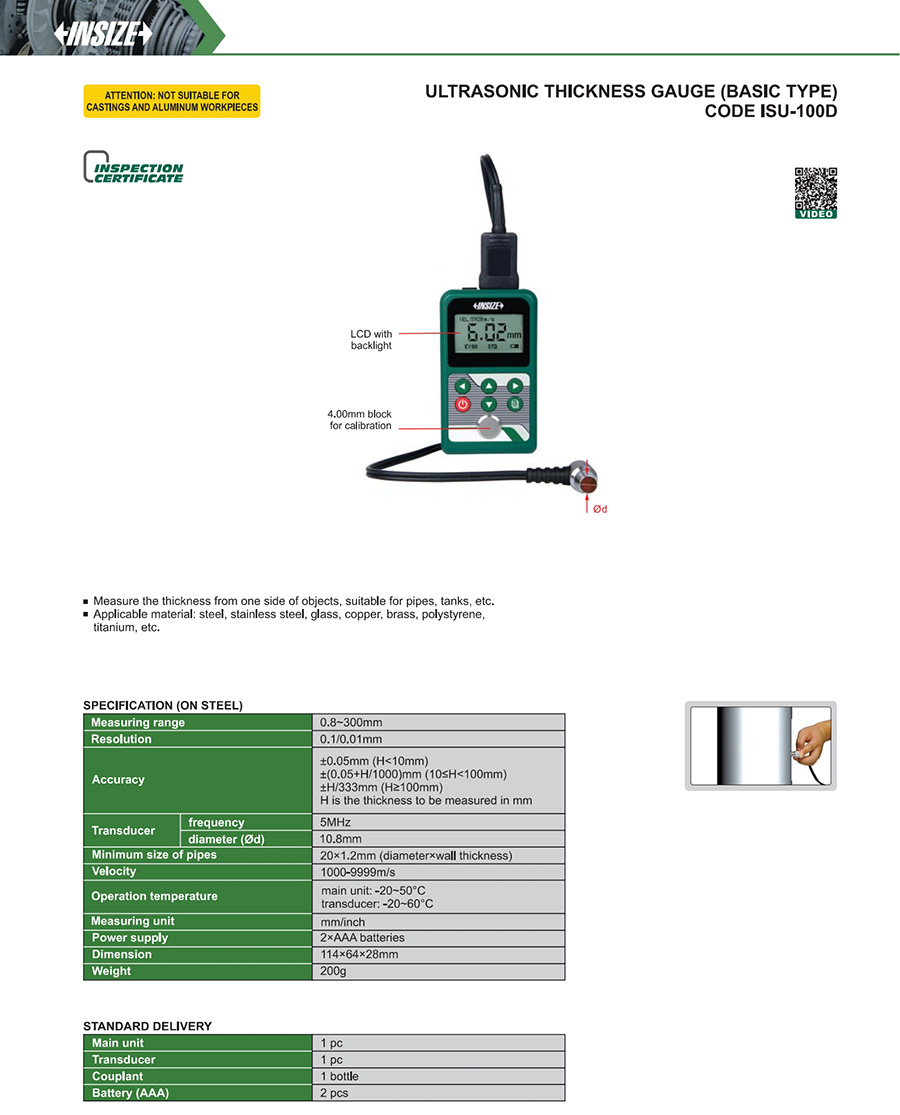 | ISU-100D | 0.8~300mm | ±0.05mm (H<10mm), ±(0.05+H/1000)mm (10≤H<100mm), ±H/333mm (H≥100mm) | 5MHz | no | 1000-9999m/s | 10.8mm |