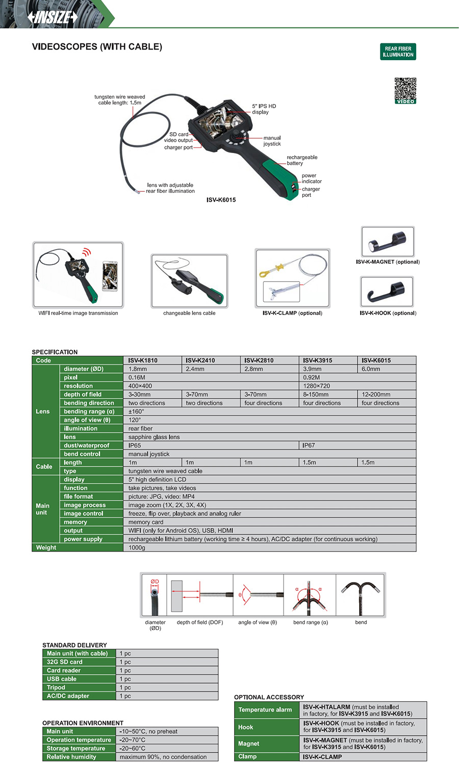 ISV-K3915 0.92M soft (tungsten wire weaved cable) front view 3.9mm 1.5m four directions rear fiber