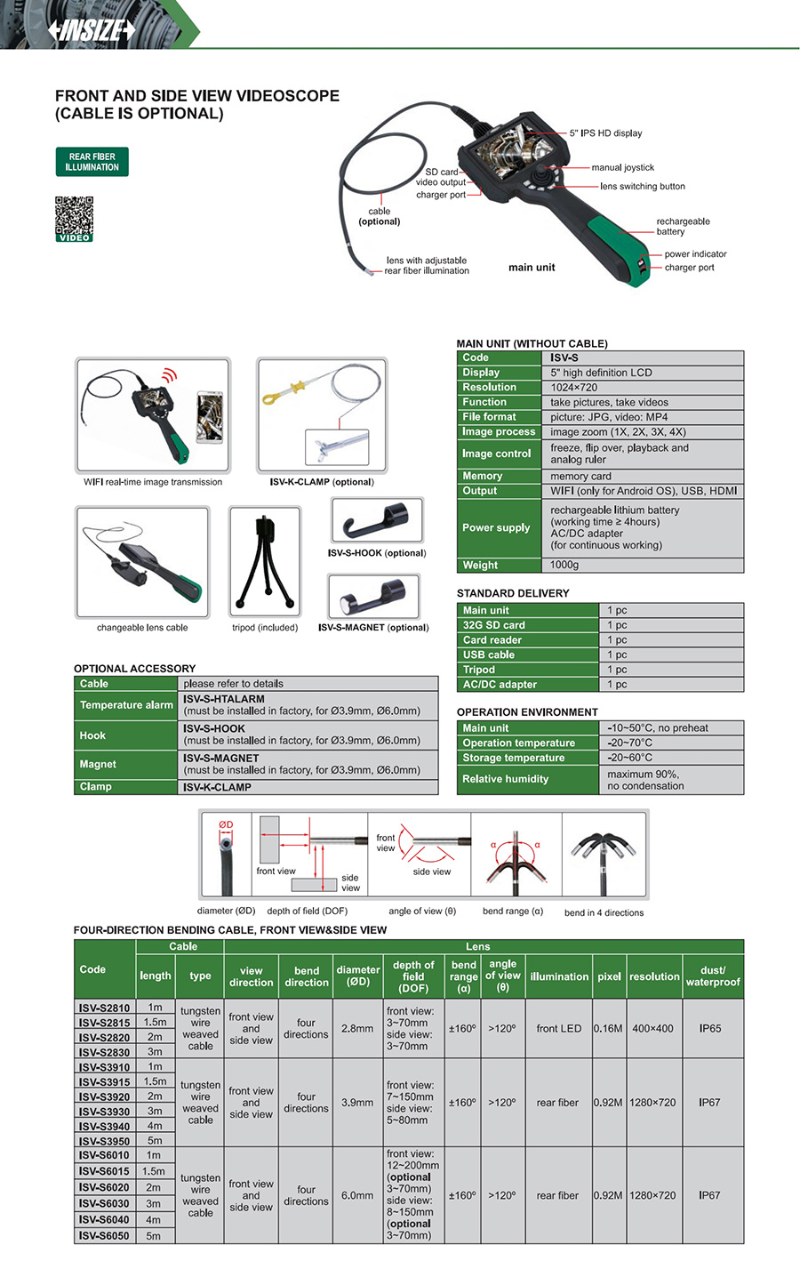 ISV-S6020 0.92M soft (tungsten wire weaved cable) front view and side view 6.0mm 2m four directions rear fiber