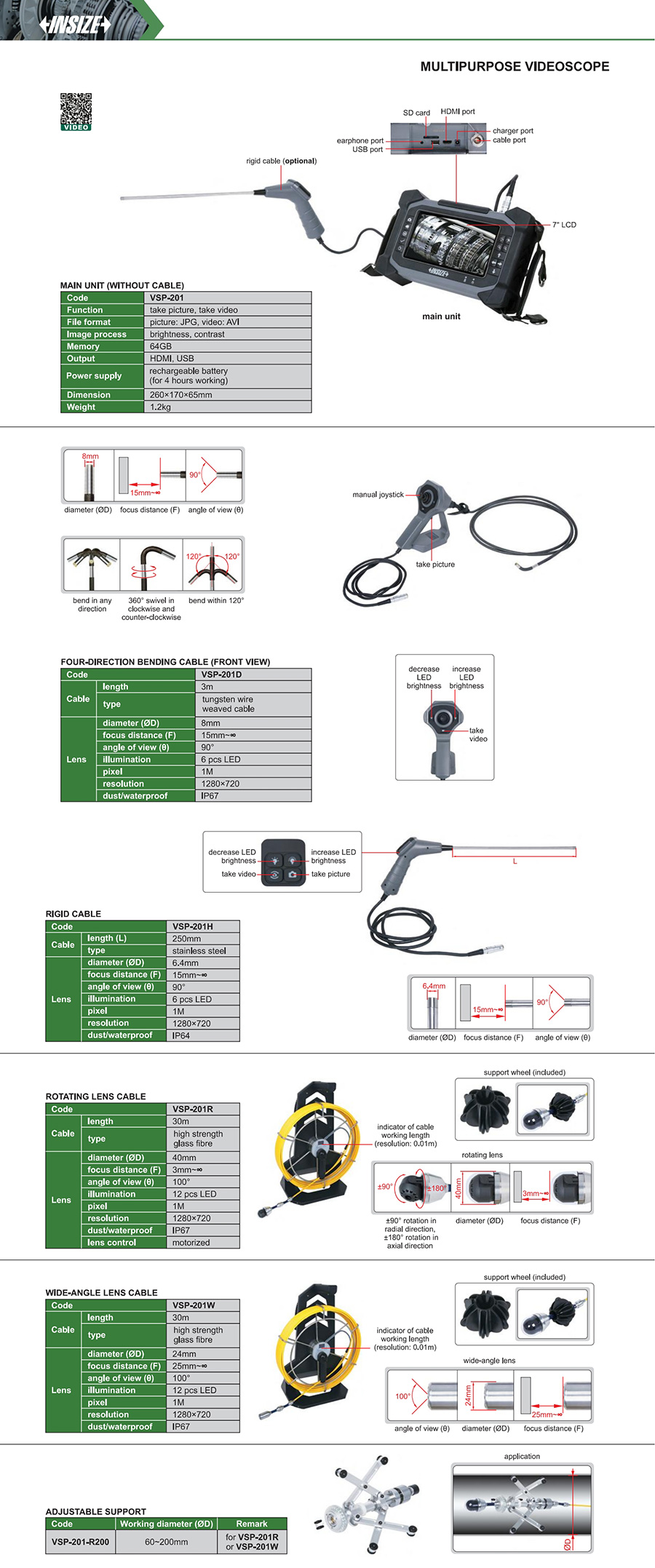 VSP-201D 1M soft (tungsten wire weaved cable) front view 8mm 3m four directions 6 pcs LED