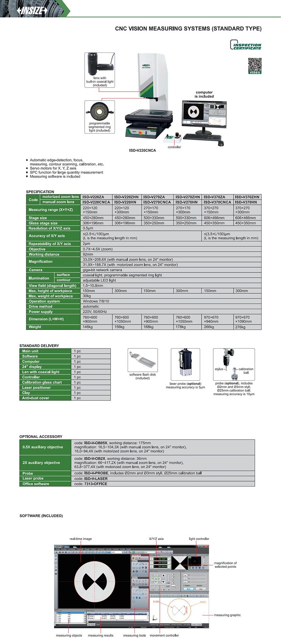 ISD-V370CNCA 370×270×150mm ≤(3.5+L/100)µm (L is the measuring length in mm) 0.5µm 2µm 33.0X~208.6X (with manual zoom lens, on 24'' monitor) 30kg