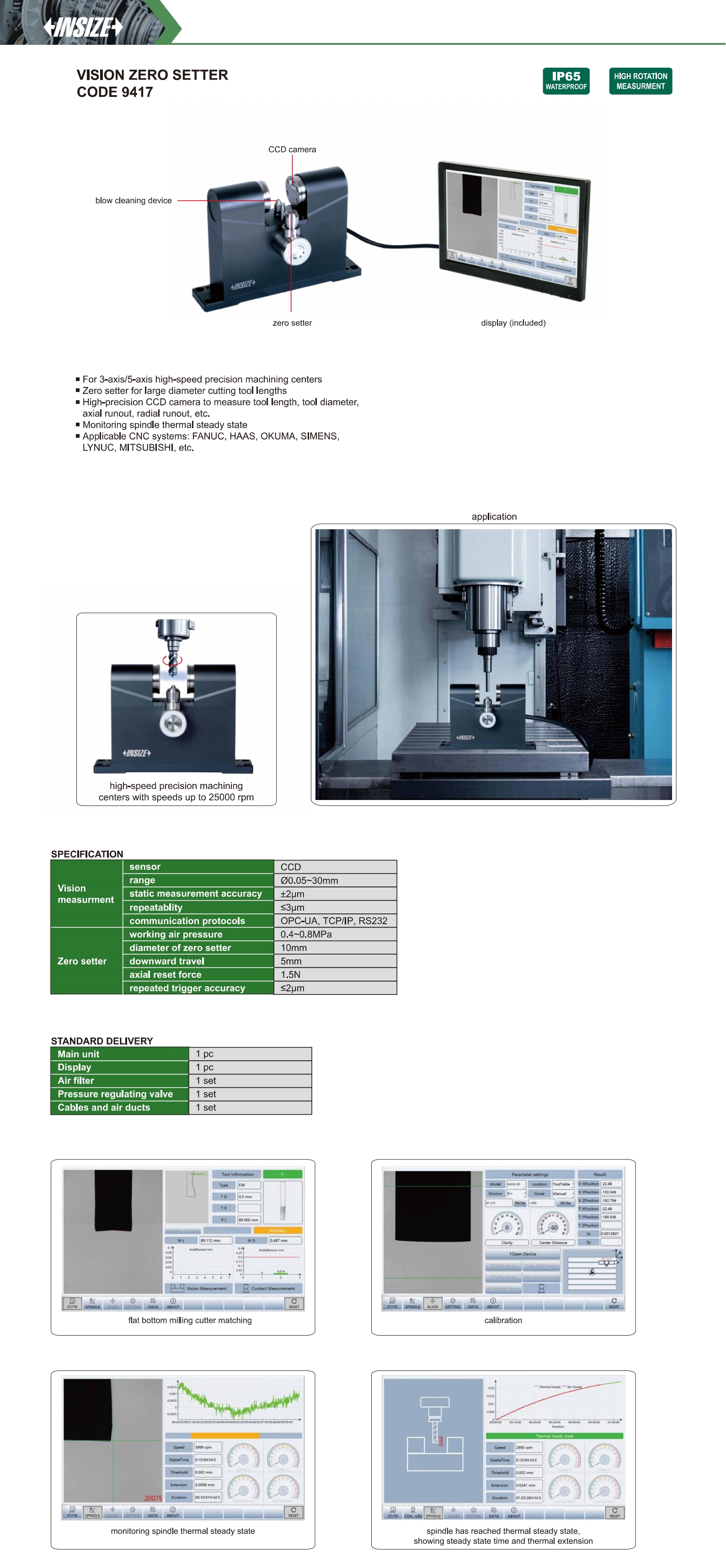 9417 Vision measurment: Ø0.05~30mm Vision measurment: ≤3μm Zero setter: 1.5N Zero setter: ≤2μm